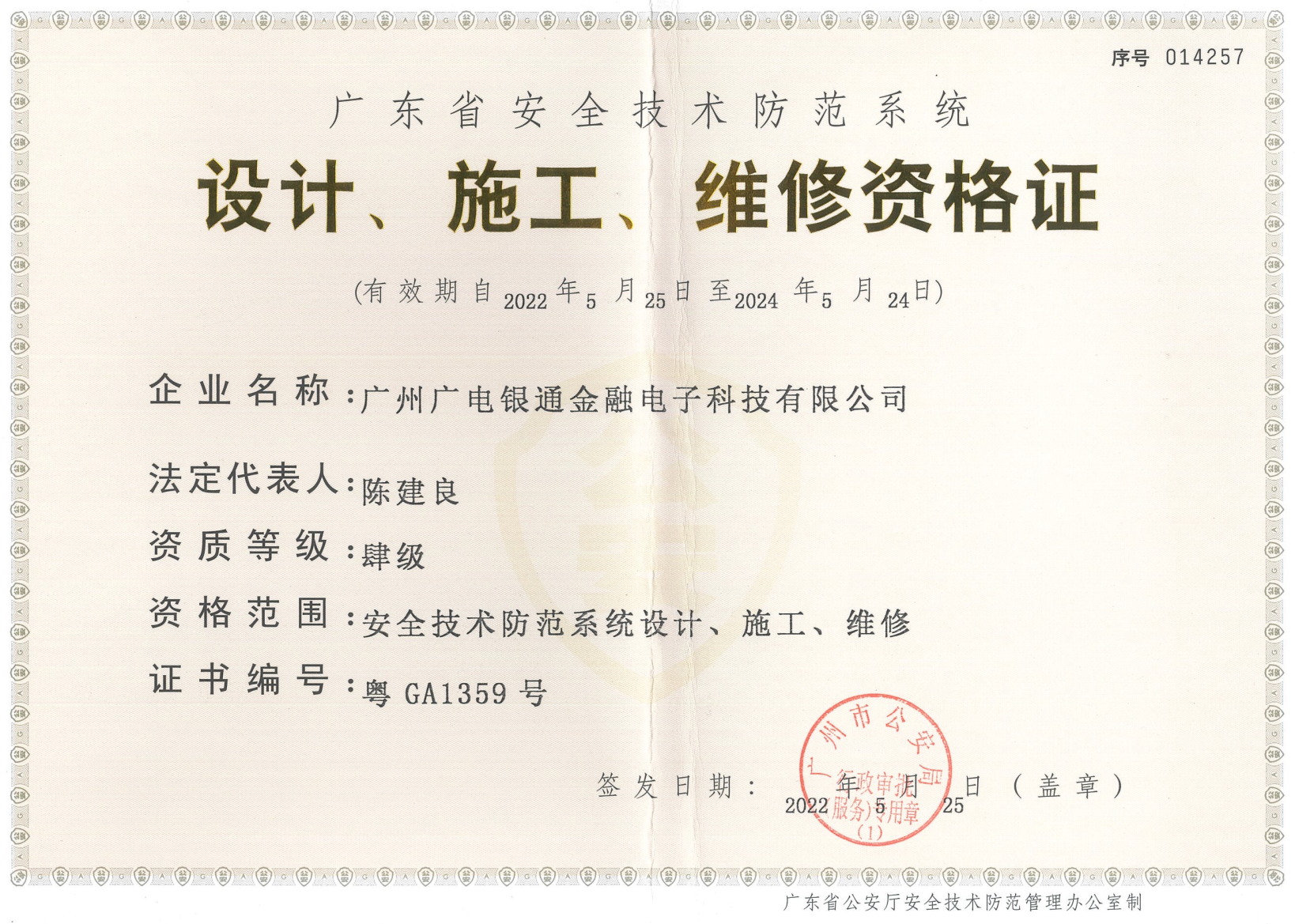 廣東省安全技術(shù)防范系統(tǒng)設(shè)計、施工、維修資格證(四級)